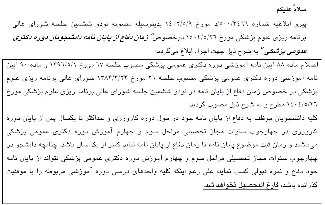 زمان دفاع از پایان نامه دانشجویان دکتری عمومی پزشکی