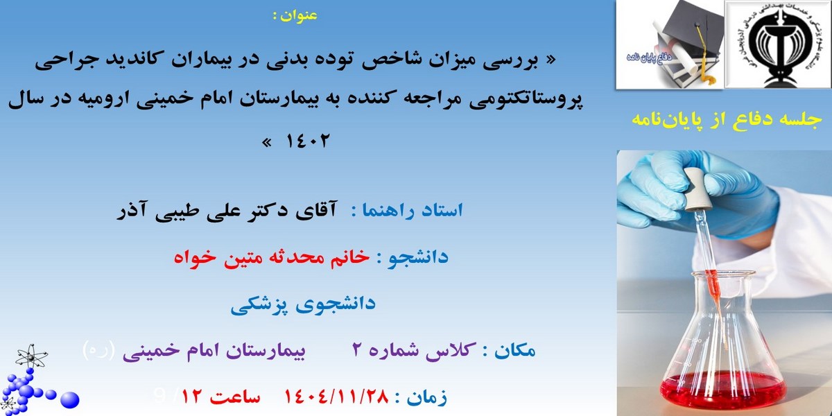 به گزارش روابط عمومی دانشکده پزشکی جلسه دفاع از پایان نامه خانم محدثه متین خواه گروه خبری : رویدادهای علمی کد خبر : 24671 کلمات کلیدی